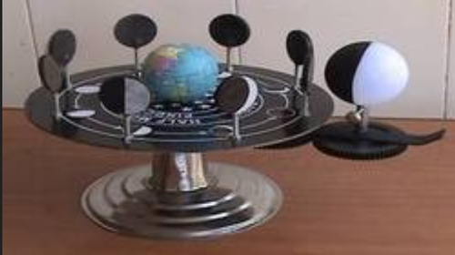 For studying the phases of the Moon. Includes Earth at the centre and Moon revolving around it in such a way that its darker side is always facing the Earth. The Earth is surrounded by 8 circles showing different phases of the Moon. Mounted on a heavy, stable base. With bulb